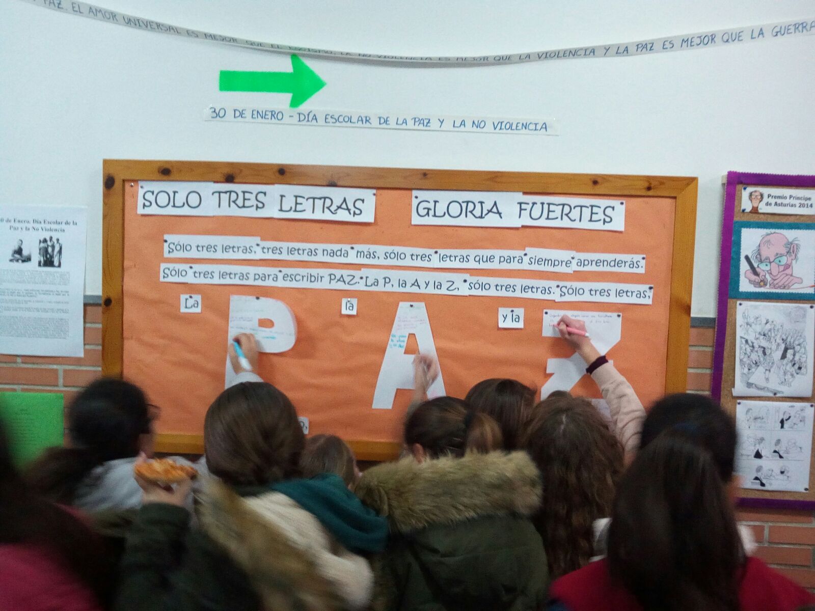 Para concienciar a nuestros alumnos de tan importante valor y contribuir de paso al fomento de la lectura, Rosa y Lucía se han vuelto a disfrazar de indias, e instalaron frente a la Biblioteca, un panel con poemas de temática pacifista. En el centro del mismo, se podía observar en gran tamaño las letras de la palabra «PAZ», y en cada una de ellas, nuestros alumnos fueron escribiendo sus pequeños propósitos para alcanzar siempre este valor.