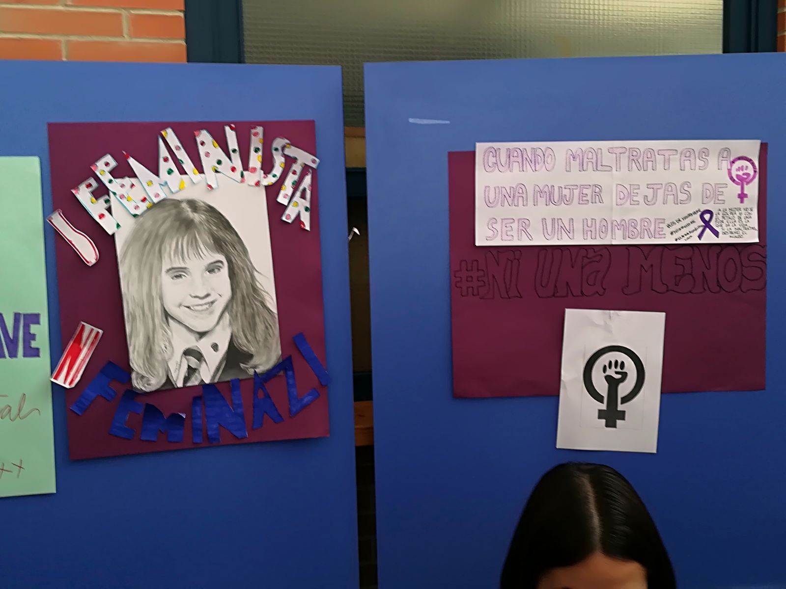 Exposición en los pasillos y la entrada de pancartas e infografías elaboradas en clase, contra la violencia y desigualdad de género.