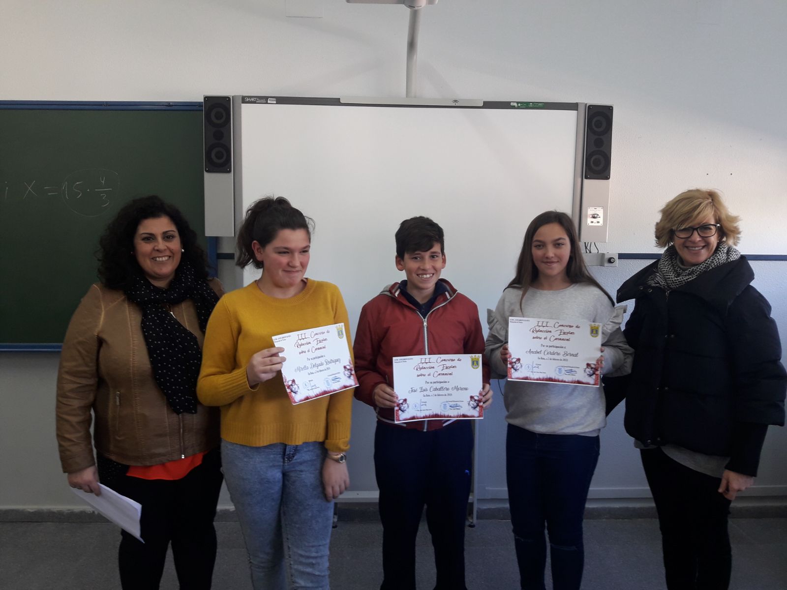 Entrega de diplomas por parte de las delegadas de Cultura y Educación a los alumnos seleccionados en el concurso que ha organizado el Ayuntamiento para elegir al pregonero infantil del Carnaval 2018. De nuestro centro han participado un gran número de alumnos de los grupos 1º y 2º ESO y estos alumnos fueron los seleccionados para la fase final: