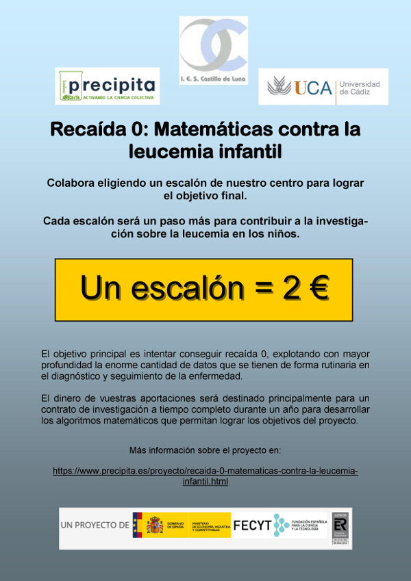 Desde el IES Castillo de Luna vamos a colaborar en la realización de este proyecto de investigación promovido por la UCA desde la plataforma Precipita. Para colaborar pedimos a toda nuestra comunidad educativa que se elija un escalón de nuestro centro con un donativo de 2 euros. Para ello los alumnos y profesores que colaboren podrán hacerlo en el primer recreo a partir de la esta semana. Igualmente se pondrá una mesa de recogida de aportaciones el miércoles a partir de las 19:00 durante la recogida de notas, para los padres que quieran también directamente colaborar. Cada escalón de nuestro instituto elegido llevará hasta final de curso el nombre de las personas que lo hayan elegido aportando 2€.
