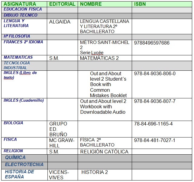 LIBROS DE TEXTO – 2º BAC Ciencias – Curso 2016-17