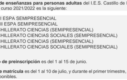 CICLOS FECHAS PROCEDIMIENTO PARA REALIZAR LA SOLICITUD C.F.G.M. SISTEMAS MICROINFORMÁTICOS Y REDES (Presencial) Del 15 al 30 de junio On line: (Secretaría virtual) https://www.juntadeandalucia.es/educacion/portals/web/formacion-profesional-andaluza/quiero-formarme/escolarizacion-2021/oferta/-/contenidos/detalle/escolarizacion-2021-0-17-3-ocgmgs-oferta-completa-presencial-de-ciclos-formativos-de-grado-medio-y-de-grado-superior-1nii1xzjkpu4y C.F.G.M. SISTEMAS MICROINFORMÁTICOS Y REDES. ADULTOS (Semipresencial) Oferta parcial Del 15 al 30 de junio On line: (Secretaría virtual) https://www.juntadeandalucia.es/educacion/portals/web/formacion-profesional-andaluza/quiero-formarme/escolarizacion-2021/oferta/-/contenidos/detalle/escolarizacion-2021-0-17-6-opdgmgs-oferta-parcial-diferenciada-de-ciclos-formativos-de-grado-medio-o-superior FORMACIÓN PROFESIONAL BÁSICA Del 15 al 30 de junio On line: […]