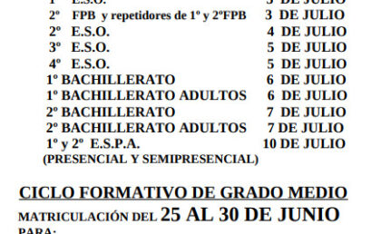 Primera adjudicación de plazas Ciclos Formativos Grado Medio y Superior: consultar en: https://secretariavirtual.ced.junta-andalucia.es/secretariavirtual/accesoConsultas/410/