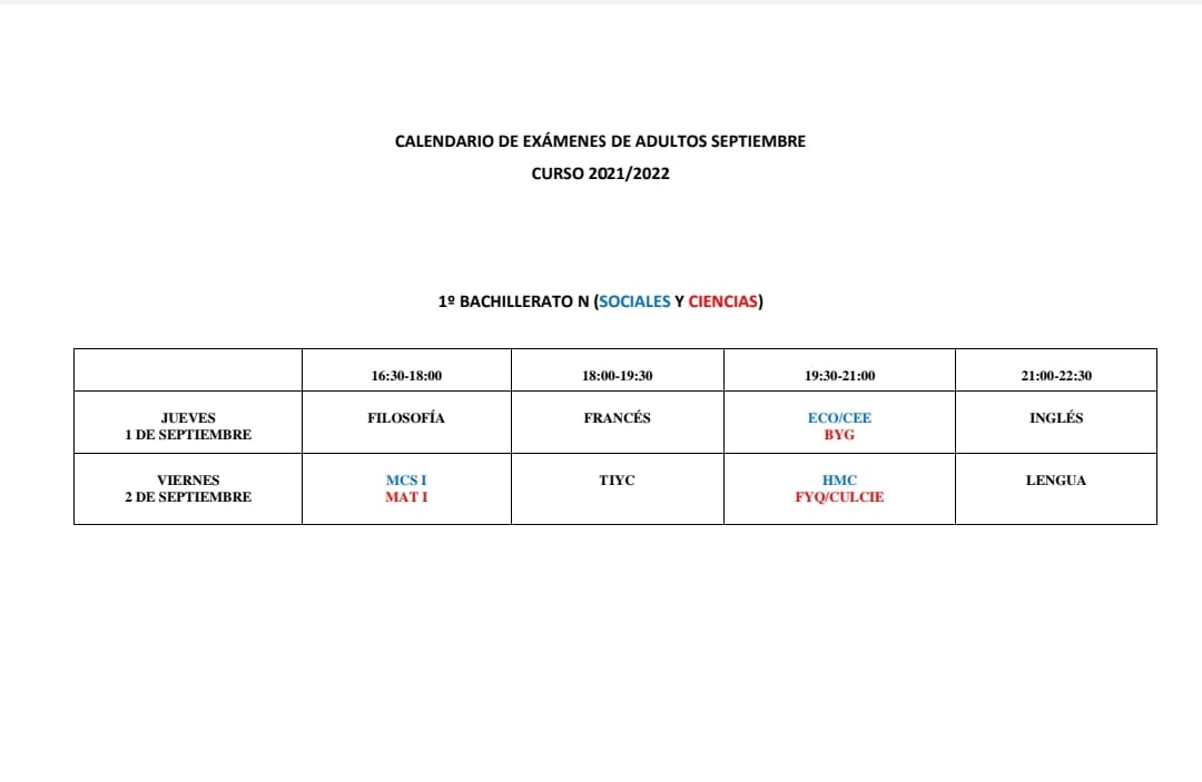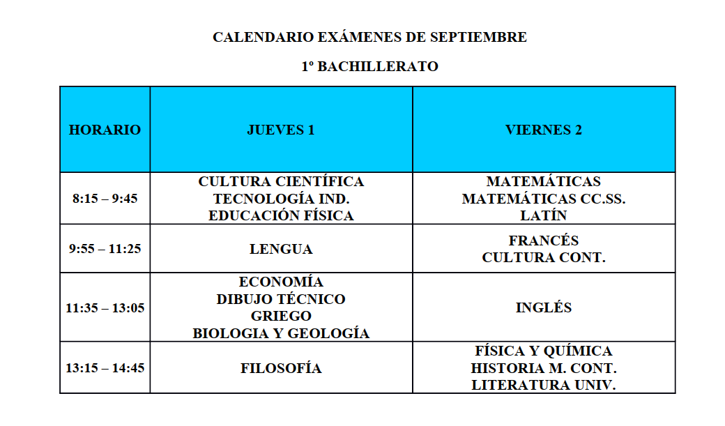 Se informa que ya está disponible el calendario de exámenes de septiembre de 1º Bachillerato para turno diurno y adultos.