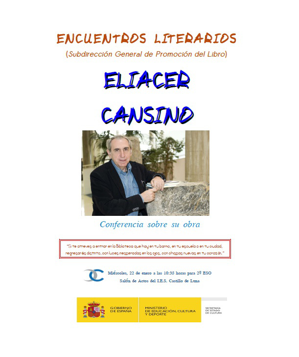 El próximo día 22 de enero el escritor y profesor de Filosofía Eliacer Cansino dará una conferencia en el salón de actos del instituto. Ha escrito diversas obras, entre otras El Misterio Velázquez, libro que han leído este año nuestros alumnos de 2ºESO.