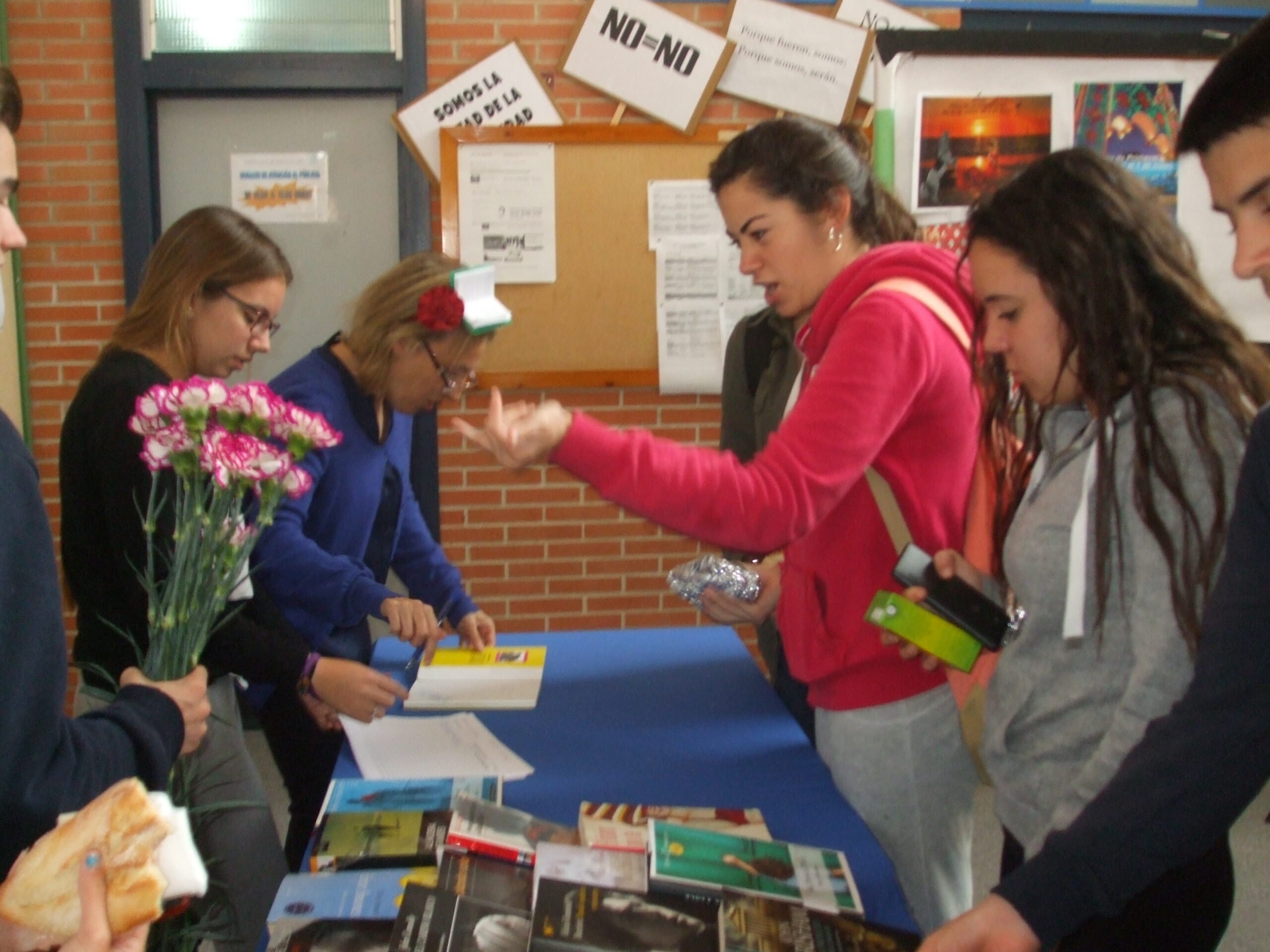 El pasado viernes en los dos recreos, Belén García, Maite y Puig, junto a un grupo de alumnos y alumnas de 4º ESO A, sacaron la biblioteca al patio. Todos los alumnos, así como profesores, que se llevaron un libro en préstamo también recibieron un clavel. Como siempre, muchos se acercaron a las mesas para ojear y seleccionar un título de su gusto. Las profesoras y los alumnos colaboradores derrocharon simpatía, entusiasmo y asesoraron a unos y otras para que acertasen en la elección de título. Felizmente podemos decir que la actividad fue todo un éxito. Damos las gracias a nuestra compañera Aurora Torres por su cooperación y buen hacer, como siempre.