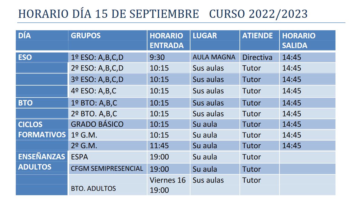 Horario de inicio del curso escolar 2022-2023 (15 septiembre)