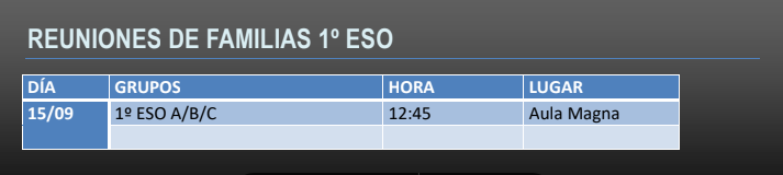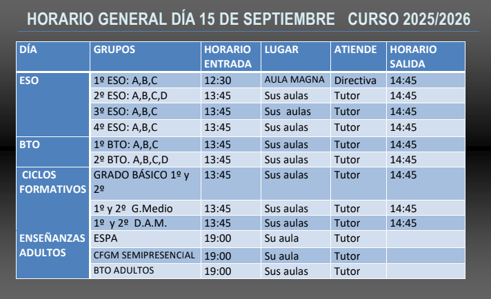 Se informa del horario oficial establecido para las presentaciones del lunes 15 de septiembre y de la convocatoria de reunión con los tutores legales de los nuevos alumnos de 1º ESO.
