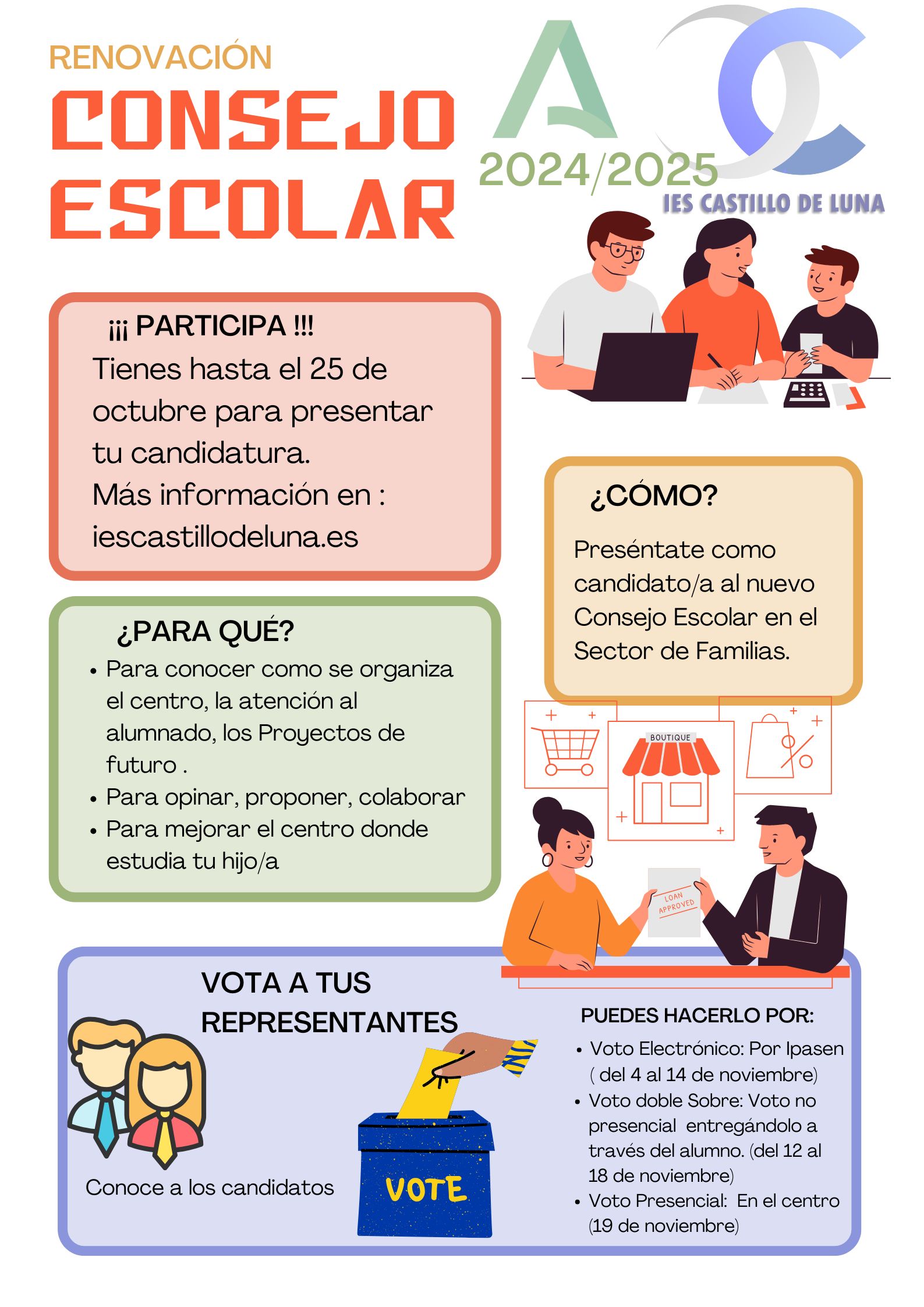 Se informa que este año se renueva el consejo escolar de nuestro centro. Se adjunta toda la documentación relativa al calendario, cartel informativo, modelo de candidaturas, y manual de voto por IPASEN.
