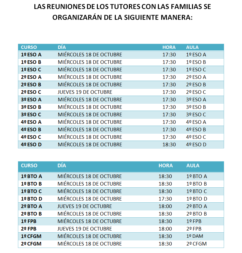 Se informa que el próximo miércoles 18 de octubre, en jornada de tarde, tendrá lugar las reuniones de los tutores de grupos con las familias. Sólo tres reuniones han sido aplazadas al jueves 19 por motivos justificados.
